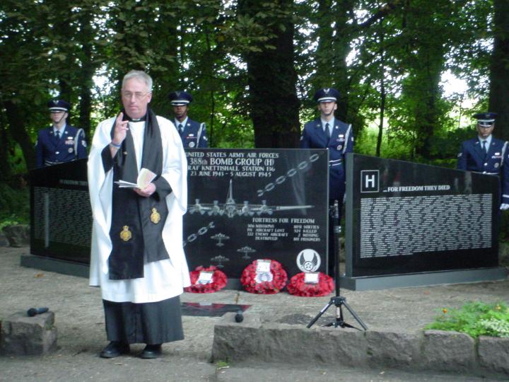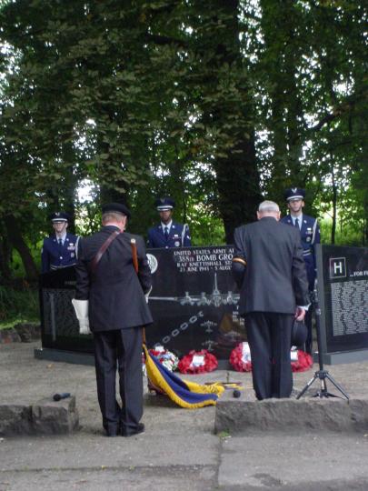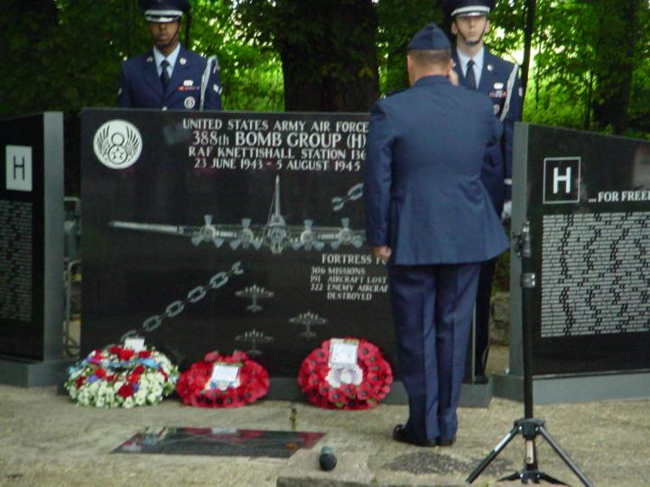 On Saturday July 14th 2012, a memorial service was held at the USAAF 388th Bomb Group memorial at the crossroads at Coney Weston. This was to dedicate the two new wings, recently inscribed with the names of those who gave their lives, of this landmark memorial which was first dedicated in 1986. This event was part of a larger Norfolk festival to celebrate the 70th anniversary of the arrival in UK of the 388th group and was attended by families of the veterans, USAF personnel as well as many local people.